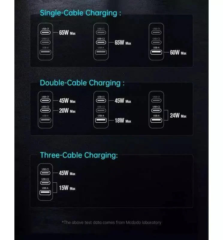 Mcdodo GaN 65W Multi Port Fast Charger Charge 3 Devices Fast - Black